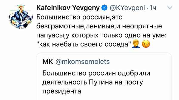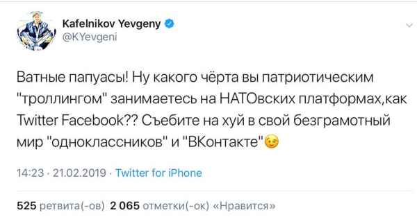 Но так как в «тоталитарном Мордоре» царит беспрецедентная свобода слова, то тот же Кафельников может писать все, что взбредёт ему в голову. И совершенно не переживать о последствиях.