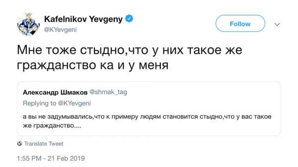 Любому, даже самому ангельскому терпению рано или поздно приходит конец. Я долго наблюдала за тем, как самый титулованный теннисист России Евгений Кафельников ведёт себя по отношению к тем, кто не разделяет его стремления жить в «прекрасной России будущего» имени Алексея Навального. Но позавчера он перешёл уже все мыслимые границы дозволенного.