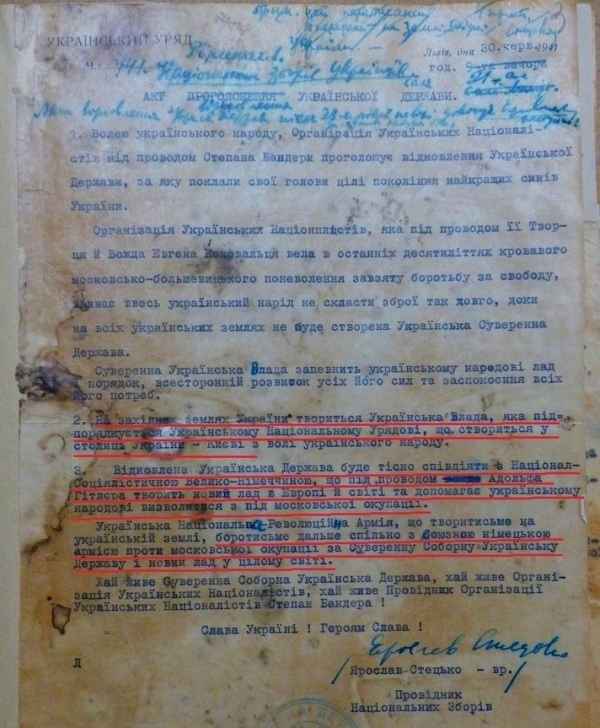 «1. Волей Украинского народа, Организация Националистов под руководством Степана БАНДЕРЫ провозглашает создание Украинского Государства, за которое положили свои головы целые поколения лучших сынов Украины.
