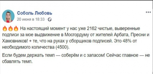 Одной из причин, по которой юристом ФБК заинтересовались правоохранители, стало ее интервью изданию «Znak» 14 июня. Тогда она утверждала, что набрала 500 подписей. Но уже через 5 дней Соболь похвасталась небывалым скачком количества подписей до 1861 штуки.