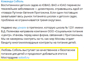 Да что там, только на этой теме она и пытается выехать в своей так называемой избирательной кампании, которой на деле нет. Просто к каждому своему посту в соцсети или на сайте добавляется фраза о том, что она якобы «выступает за качественное питание для детей и будет добиваться этого в Мосгордуме».