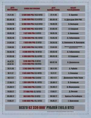 Сбор осуществлялся посредством двух кошельков. Первое поступление на кошелек 3QzYvaRFY6bakFBW4YBRrzmwzTnfZcaA6E в размере 0,0096 BTC (500 рублей) произошло 8 декабря 2016 года. Вскоре в ход пошли крупные «пожертвования». Например, только за первую неделю февраля на кошелек поступило 29 BTC (около 2 миллионов рублей). Самая скромная из транзикаций – 5 BTC (300 тысяч рублей).
