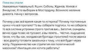 Так, например, читатель одного из Telegram-каналов уличил Навального, Яшина, Соболь, Жданова, Милова и Янкаускаса в политическом мазохизме. По мнению москвича, кампания кандидатов в Мосгордуму от оппозиции больше напоминает истерику.