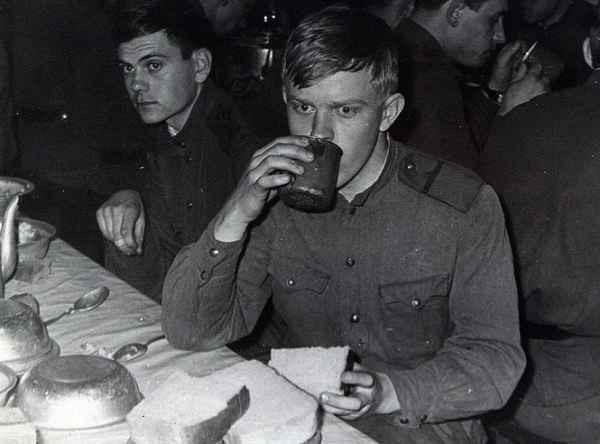 На обед часто давали «борщ» – мерзкую субстанцию с большим количеством капусты и картошки. В годы Великой отечественной тушенку разрешалось использовать лишь по праздникам, обычно же «борщ» заправляли салом или жиром. Тот же подход сохранился и после окончания войны: в «борще» аромат чего-то мясного практически не улавливался, а если и попадалось «мясо», то это были жилы или сало.
