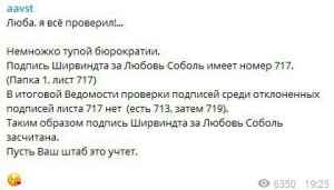 По словам Венедиктова, подпись Ширвиндта находится в Папке №1, лист №717. В ведомости с отклоненными подписями вышеупомянутого листа нет. Есть, к примеру, 713 или 719. Таким образом, подпись Михаила засчитана, а Соболь подняла шумиху на пустом месте.