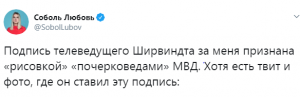 В своем твиттер-аккаунте она придралась к тому, что подпись Михаила Ширвиндта за нее якобы признали «рисовкой». По этому поводу высказался главред «Эха Москвы» Алексей Венедиктов. В Телеграм-канале он написал, что проверил данный факт. Оказалось, Соболь очередной раз хайпит и не более того.