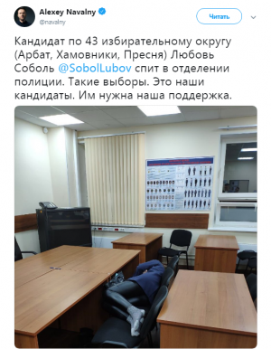 В этот раз Навальный пошел еще дальше. Теперь он проигнорировал своих приближенных. Задержанной вчера на несанкционированном митинге Соболь он пожелал спокойной ночи в ОВД, на этом поддержка своим кандидатам была исчерпана – несмотря на все попытки Любы привлечь внимание к собственной персоне.
