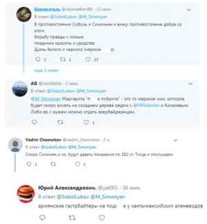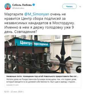 Так, на страницы Соболь в Twitter появилось сообщение о том, что якобы Симоньян не нравится Центр сбора подписей за независимых кандидатов расположенный на Рождественском бульваре.