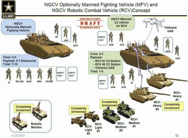 Проект получил название Robotic Combat Vehicle. Бронетанковый «рой» минимум из 10 машин будет включать в себя три платформы - RCV-Light, RCV-Medium и RCV-Heavy. Самая легкая из платформ, до 7 тонн – легкие роботы, которые будут выполнять преимущественно разведывательные функции. На представителей платформы RCV-Medium весом до 10 тонн ляжет огневая поддержка. Машины получат пушки среднего калибра, комплексы ПТУР и другие вооружение. Тяжелая платформа (до 20 тонн), которая будет играть роль «погонщика роботов», будет включать бронетранспортеры и легкие танки. Концепция также предполагает использование разных типов БПЛА.