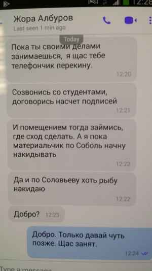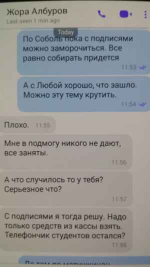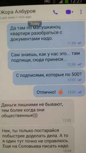 Поковырявшись немного в глобальной сети, из данного отрывка переписки не сложно догадаться, что собеседниками являются Кулаченков Никита и Албуров Георгий, которые согласно данным на официальном сайте ФБК занимаются расследованиями. На деле же, это профессиональные тролли и пиарщики, главная задача которых составлять компроматы на неугодных Навальному людей и делать подтасовки. Естественно данные господа не забывают запустить свои щупальца в карман фонда. Какой учитель, такие и ученики.