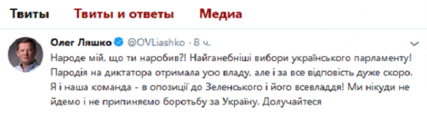 «Народ мой, что ты наделал?! Самые позорные выборы украинского парламента! Пародия на диктатора получила всю власть», — написал Ляшко.