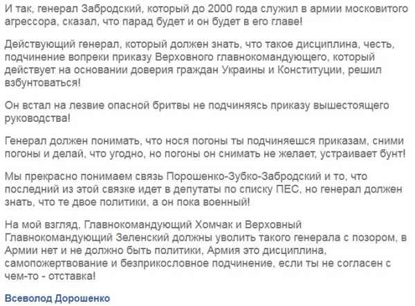 Забродский же находится в жесткой оппозиции к действующему президенту и делает все, чтобы его дискредитировать в глазах как военнослужащих, так и населения Украины...