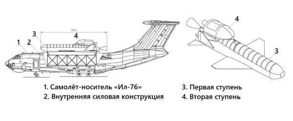 На каждую ступень будет установлено по одному жидкостному ракетному двигателю, работающему на паре кислород + керосин. В качестве самолёта-носителя был выбран легендарный транспортник «Ил-76», идеально подходящий по характеристикам. Грузовой отсек самолёта оборудуется массивной силовой конструкцией массой более 6 тонн, сверху которой располагается ракета.