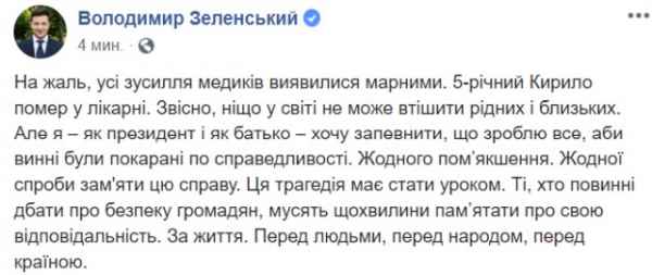 А ведь тогда было гораздо больше причин требовать отставки главы МВД Авакова. И требовали. Украинские граждане требовали. После смерти пятилетнего Кирилла из Переяслава-Хмельницкого в Сети началось возмущение в целом политикой МВД, активисты пикетировали МВД в Киеве. А президент Украины Владимир Зеленский отделался… соболезнованиями в своем любимом Facebook.