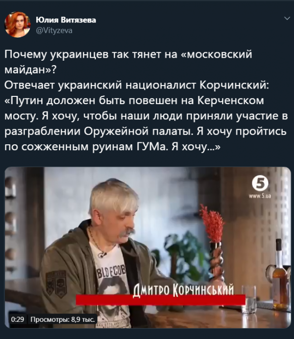 "Мы должны воевать у них. Хочу, чтобы Путин был повешен на Крымском мосту, чтобы наши бедные ребята приняли участие в разграблении бриллиантовой палаты московского Кремля, хочу пройтись по сожженных развалинах ЦУМа, который выходит на Красную площадь, хочу помочиться в Мавзолее. Я хочу очень многих вещей, и они должны быть сделаны. Вот до тех пор война не должна быть окончена", — поделился своими мечтами Корчинский.
