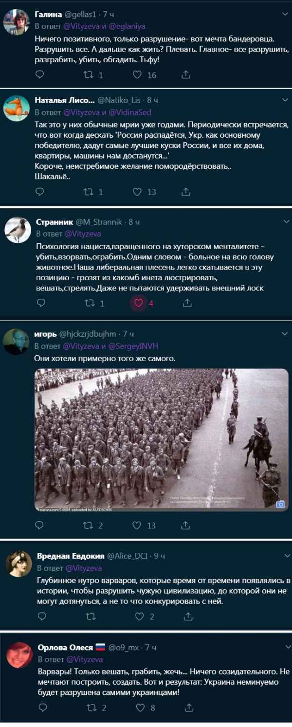 "Психология нациста, взращенного на хуторском менталитете - убить, взорвать, ограбить. Наша либеральная плесень легко скатывается в эту позицию - грозят люстрировать, вешать, стрелять. Даже не пытаются удерживать внешний лоск",- добавил пользователь под ником Странник.