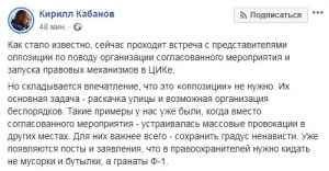 Конфликт нужен оппозиции, больше чем что-либо. Кирилл Кабанов высказывает мнение, что «организаторы беспорядков» переговоры не нужны. Их основная задача – раскачка улицы и беспорядки. Им необходимо сохранить градус ненависти и довести дело до гражданского противостояния.
