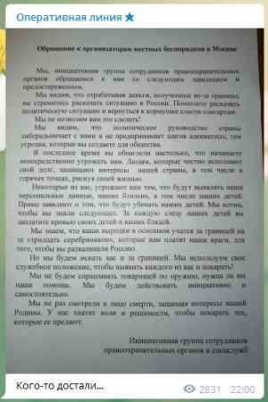 После появления угроз в адрес силовиков и их родных, сотрудники правоохранительных органов жестко. Их открытое письмо опубликовал один из телеграм-каналов.