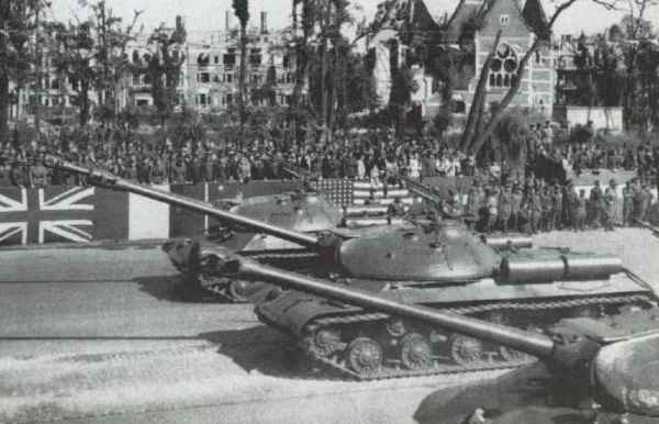 На всеобщее обозрение ИС-3 были представлены в Берлине 7 сентября 1945 г. на параде победителей в честь окончания Второй мировой войны. Эти 50-тонные гиганты, прошедшие по Александерплатц, вызвали восхищение иностранных наблюдателей и союзников по антигитлеровской коалиции. Все были потрясены наличием у Советов столь мощной бронетехники. Многие считают, что новые тяжелые танки были ничем иным как демонстрацией силы советского оружия, что могло восприниматься как ответ на американские атомные бомбардировки японских городов. Недаром на локомотиве, который вез наши танки в Берлин, красовался плакат: «Боевой привет шлёт Родина!».