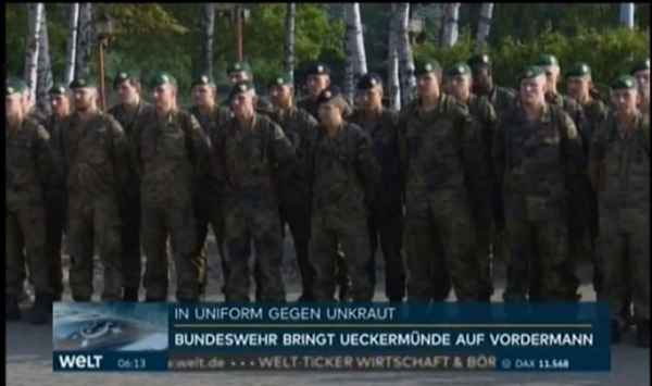 «Бундесвер. Снаряжение до сих пор оставляет желать лучшего, истребители едва справляются с учебными полётами, подлодки и фрегаты сидят на мели, а всё необходимое для операций за границей приходится закупать на частные деньги. И это всего лишь короткий список проблем. И хотя конституционная обязанность не предусматривает участие в операциях внутри страны, всё же войска стоят на пороге важной «битвы».