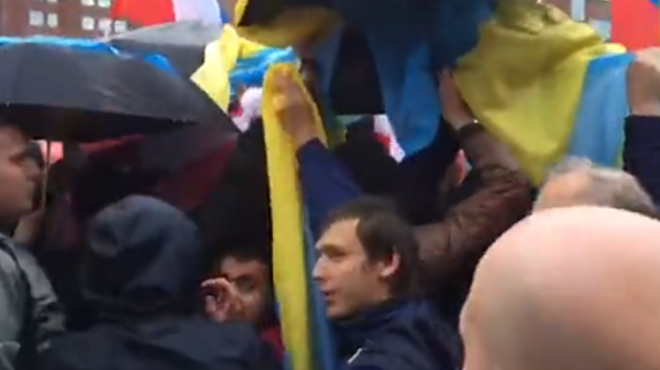 Видеозапись запечатлела, как молодой человек вырывает украинский флаг у оппонента и бросает его на землю. Завязавшуюся после этого потасовку быстро разняли.