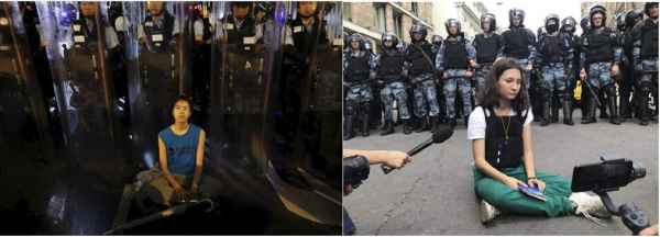 Ее фотография сделана в классической для «революции» позе: беззащитный молодой человек на фоне полицейских. Такие же фотографии сейчас делают в Гонконге.