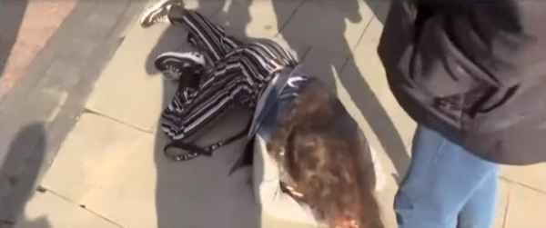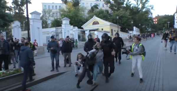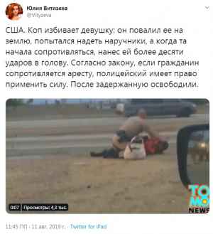 Обратите внимание, что на видео девушка выбила резиновую дубинку из рук полицейского, а когда он попытался ее поднять, она наступила ему на ногу и пыталась ударить его еще раз.