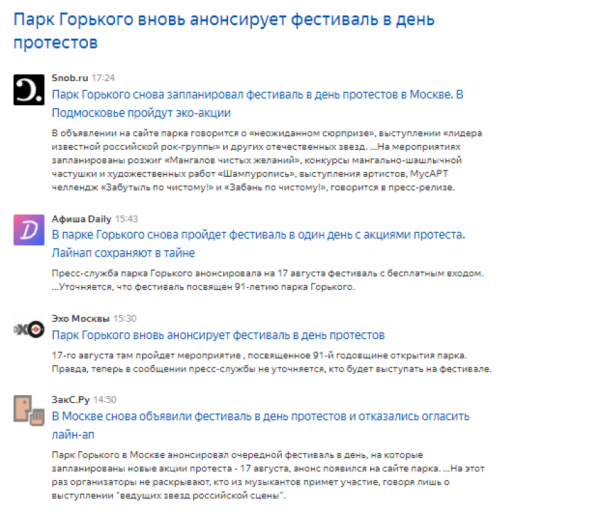 Парку 17 августа исполняется 91 год. Каждый год в этот день на его территории проводятся праздничные мероприятия, которые посещает огромное количество москвичей. Однако прооппозиционные издания это ни капли не смущает. Они, как под копирку утверждают, что мероприятие анонсировано только сейчас, хотя о нем было известно ещё до митинга на Сахарова. Например, Риа новости и «АИФ» написали об этом 9 августа.