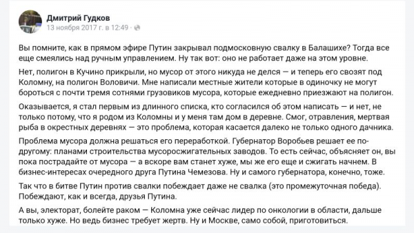 Однако в 2017 году возникли проблемы. Губернатор МО Воробьев изъявил желание приостановить работу полигона и построить на его месте современный мусоросжигательный завод. Такой исход совершенно не устраивал «мусорных магнатов» и они вышли на митинги, подключив местных жителей. Им, естественно, они нарисовали картину, на которой завод по сжиганию мусора навредит экологии, хотя по факту он мог бы навредить лишь стабильным доходам. Из-за этого Гудковы попали под административный арест, но зарекомендовали себя в глазах жителей Коломны, как борцы за экологию.