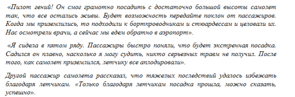 Пилоты стали героями этого дня, спасшими 226 жизней. Пассажиры рассказывают, как это происходило, и как потом они просто подходили к пилотам и бортпроводникам, чтобы обнять их и поблагодарить за второе рождение.