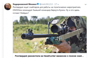 Последней выдумкой Ходора стало то, что Росгвардия якобы ищет снайперов для работы на акциях протеста. На самом деле это, конечно, полнейший бред. Об этом сообщили и в самом ведомстве. Там заявили, что для охраны митингов снайперы не привлекаются. Но они служат в ведомстве, потому что, на минуточку, Росгвардия борется с терроризмом.