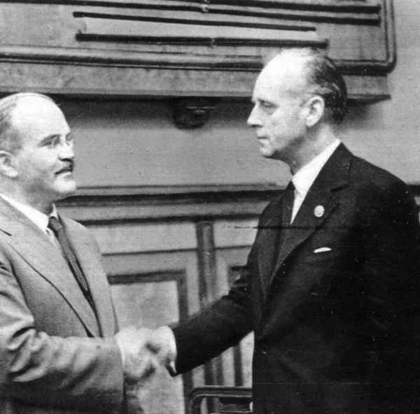 Напомню, пакт Молотова-Риббентропа был заключен одноименными министрами иностранных дел СССР и Германии. Пакт предусматривал взаимное ненападение друг на друга и невмешательство в случае агрессии каких-либо третьих стран в течение 10 лет.