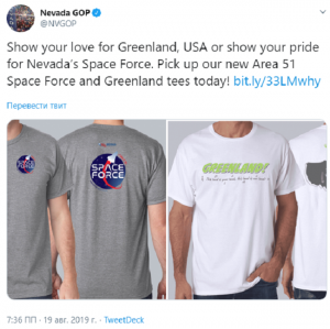 В свою очередь, Республиканская партия Невады (филиал общенациональной политсилы) начала собственную аналогичную акцию, выпустив футболку с «американской» Гренландией, но в другом дизайне.