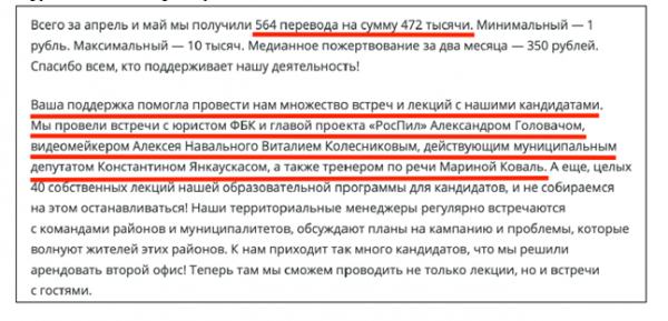 Так вот если посмотреть на отчет 1 июня, то 472 000 рублей якобы потрачены на аренду помещения, оплату лекторам, которые проводили мероприятия, и зарплату сотрудникам штаба.