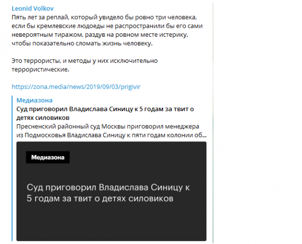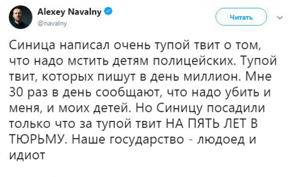 Либералы, конечно, так не думают. Им не нужно шоу, поэтому они устроили очередную истерию. Навальный на странице в соцсети написал, что человека посадили якобы из-за одного «тупого твита». На деле судебное решение было вынесено не за твит, лайк или репост. Этот недочеловек получил приговор за призыв к насилию в отношении детей.