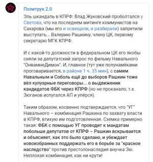 Интерес «бабы в красном» к коммунистам возник не на пустом месте. Как выяснилось, в проекте Навального «Умное голосование» предлагается голосовать в основном за коммунистов. О том, что Навальный небескорыстно договорился с Валерием Рашкиным, членом ЦК и первым секретарем МГК КПРФ, о включении коммунистов в «список Навального» подозревали уже давно. Но лишь недавно эти версии подтвердились.