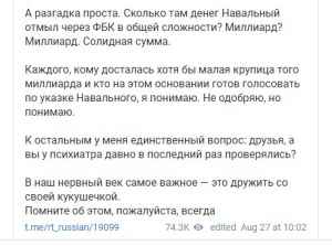 «Сколько там денег Навальный отмыл через ФБК в общей сложности? Миллиард?» — пишет Ortega.