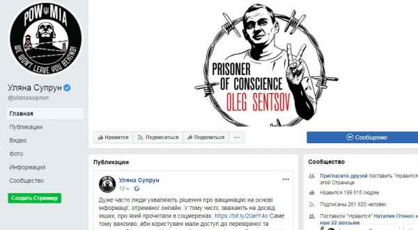 Так, на странице Супрун в соцсети до сих пор висит изображение Сенцова в обрамлении колючей проволоки с надписью «Узник совести».
