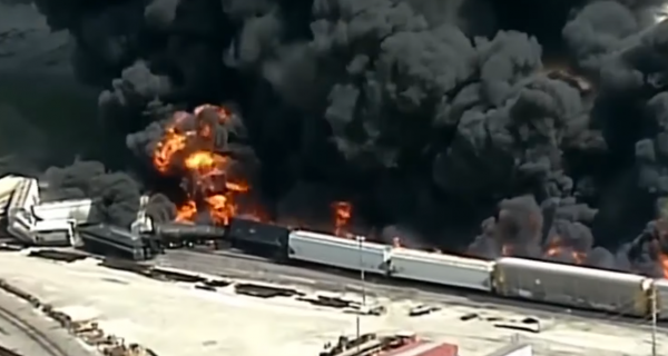 На официальном Youtube канале информационного агентства RT появилась видеозапись с места аварии. На кадрах видно, что огонь перебрался на другие вагоны состава. В результате горения химических веществ образуется плотный черный дым.