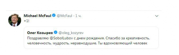 С иностранными спонсорами Люба тоже активно сотрудничает. Видимо, поэтому ее поздравил и бывший посол США в России, профессор излюбленного либерастами Стэнфорда Майкл Макфол.