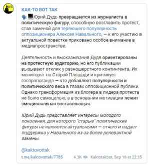 Практически одновременно с этим в США укатил Навальный. Тем временем Дудь бодрыми темпами выходит на либеральный Олимп, и кто знает, может к возвращению Алешки из отпуска «свято место» лидера тусовки окажется занято прыщеватым, но амбициозным и беспринципным юнцом.