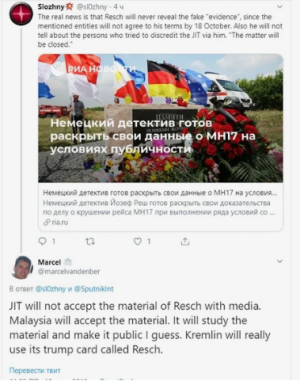 Однако блогер Marcel, специализирующийся как раз на теме крушения Боинга выдвинул интересную версию, что если совместная следственная группа не примет условия Реша, если предложением может заинтересоваться Малайзия, также как и Россия ищущая ключ к разгадке. Напрасно Голландия думает, что следы своих преступлений можно так легко скрыть, ведь Москва вряд ли откажется использовать данные детектива в качестве своего козыря, на который у заказчиков этой трагедии точно не будет ответа.