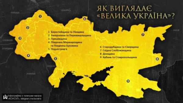 Чем мы хуже? Задается вопросом Чаплыга, и предлагает вернуть исторические земли, заявляя о том, что истинная территория Украины не совпадает с ее политическим границами. Для наглядности в Киеве уже разработана карта с «реальными» границами Украины. Естественно, что наибольшие территориальные претензии у великоукраинцев - к России.