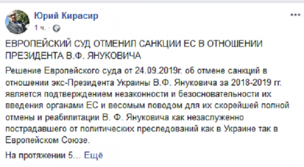 «Европейский суд отменил санкции ЕС в отношении В.Ф. Януковича. Решение Европейского суда от 24.09.2019г. об отмене санкций в отношении экс-президента Украины Януковича за 2018-2019 гг. является подтверждением незаконности и безосновательности их введения органами ЕС и весомым поводом для их скорейшей полной отмены и реабилитации Януковича как незаслуженно пострадавшего от политических преследований как в Украине, так в Европейском Союзе», — написал он, добавив, что «протяжении всего этого времени власти многих стран, включая все страны Европейского Союза и Швейцарию официально подтвердили отсутствие на их территории банковских счетов или любых иных активов, принадлежащих Виктору Януковичу».