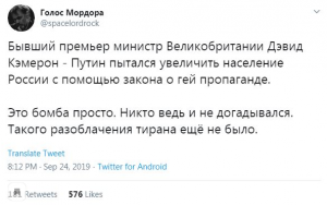 Известно, что в Великобритании какие-то странные понимания о «разоблачениях» и «тирании». Тем не менее, бывший британский премьер Дэвид Кэмерон попытался удивить мировую общественность своими мемуарами «Под запись», которые увидели свет неделю назад. В своей книжонке он попытался «разоблачить» президента России Владимира Путина через тему пропаганды гомосексуализма.