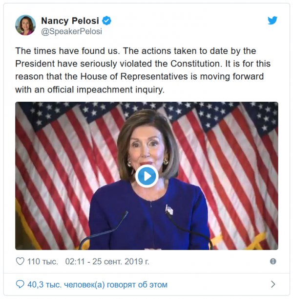 4 сентября одна из лидеров Демократической партии Нэнси Пелоси объявила о начале импичмента президента США Дональда Трампа. Поводом к началу процедуры послужило «украинское дело»: Трамп якобы давил на украинского президента во время телефонного разговора, требуя помощь в получении компромата на Джо Байдена, кандидата в президенты от Демократической партии.