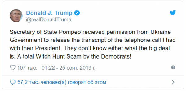 Расследование же, инициированное демократами, Трамп в свойственной ему манере окрестил «охотой на ведьм» и обещал предоставить полную стенограмму разговора с Зеленским.