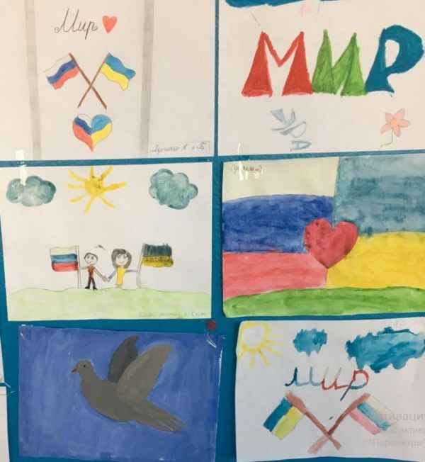 Многие из детей, еще не испорченные националистической и русофобской пропагандой, изобразили на своих рисунках, символы Украины и России. Таким образом дети продемонстрировали, что в их понимании Мир – это дружба между нашими странами.