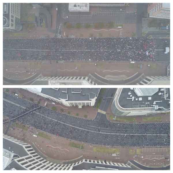 На видео видно, как хомяки обманывали счетчик, инициировав «хоровод» через детекторы. На всех ракурсах с квадрокоптеров видно лишь жидкую толпу, в основном сконцентрированную у сцены, и никакими 20 тысячами там не пахнет.
