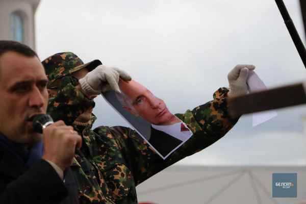 Белорусские оппозиционеры разорвали портрет президента России Владимира Путина на протестном пикете.